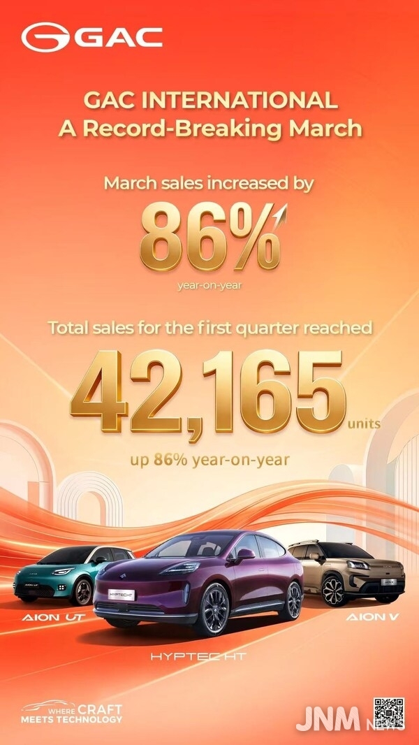 제이앤엠뉴스 | 광저우, 중국 2026년 4월 4일 -- GAC가 3월 1만 7031대의 자체 브랜드 월간 판매량을 기록하며 강한 해외 성장 모멘텀을 이어갔다. 1분기 누적 판매량은 4만 2165대로, 전년 동기 대비 86% 증가했다. GAC는 '원 GAC 2.0(One GAC 2.0)' 전략과 '기술 주도형 GAC, 전체 체인 생태계와 함께 글로벌 도약(Tech-Driven GAC, Advancing Global Reach with a Full-Chain Ecosystem)'이라는 기조 아래 제품 수출에서 글로벌 운영으로의 전환을 가속하고 있다.