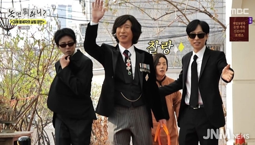 제이앤엠뉴스 | MBC '놀면 뭐하니?'에서 양상국이 '김해 왕세자' 콘셉트로 출연해 서울 나들이를 선보였다. 4일 방송에서 유재석은 양상국의 보디가드 역할을 맡았으며, 하하와 허경환은 각각 '하코기', '허닥스'라는 이름의 왕실견으로 분장했다. 주우재는 수행원으로 등장했다.