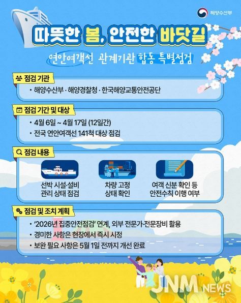 제이앤엠뉴스 | 연안여객선의 안전 확보를 위해 해양수산부, 해양경찰청, 한국해양교통안전공단이 전국적으로 합동 특별점검을 실시했다.