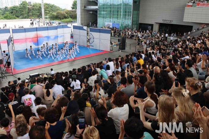 약 50명으로 구성된 시범단이 화려한 고난도 기술로 약 60분간 태권도 시범공연을 선보이자 관중석 여기저기서 탄성과 함께 박수가 쏟아졌다.