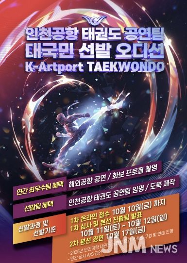 제이앤엠뉴스 | 인천국제공항공사는 인천공항에서 진행되는 태권도 상설공연인 ‘2025-2026 인천공항 태권도 상설공연’에 참여할 태권도 전문 공연팀을 공개 모집한다고 28일 밝혔다.
