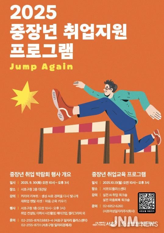 제이앤엠뉴스 | 서울 서초구는 중장년의 구직 활동을 응원하기 위해 오는 30일 취업지원 프로그램 ‘점프 어게인(JUMP AGAIN)’을 개최한다고 밝혔다.