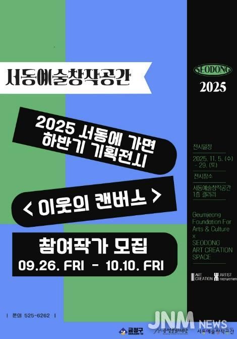 제이앤엠뉴스 | 부산시 금정구 금정문화재단은 오는 11월 5일부터 열리는 서동예술창작공간 하반기 기획전시 서동에 가면 '이웃의 캔버스' 전시에 참여할 작가를 9월 26일부터 내달 10일까지 모집한다고 밝혔다.