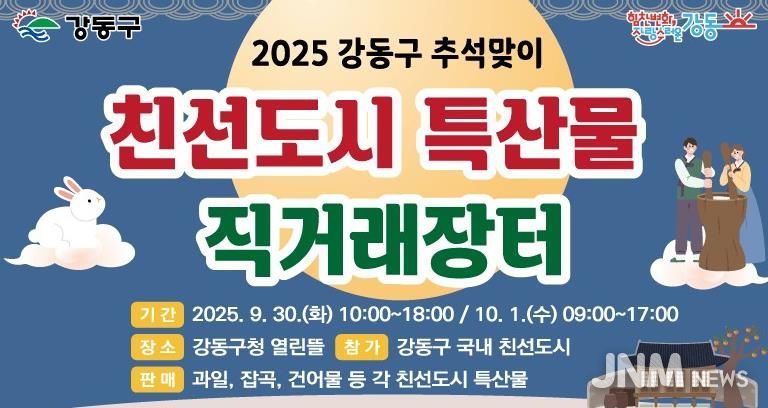 제이앤엠뉴스 | 강동구는 2025년 추석을 맞이해 오는 9월 30일과 10월 1일 이틀간 강동구청 열린뜰에서 ‘친선도시 특산물 직거래장터’를 개최한다고 29일 밝혔다.
