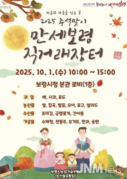 제이앤엠뉴스 | 보령시는 추석을 맞아 10월 1일 보령시청 본관 1층 로비에서 ‘2025 추석맞이 만세보령 농특산물 직거래장터’를 운영한다고 밝혔다.
