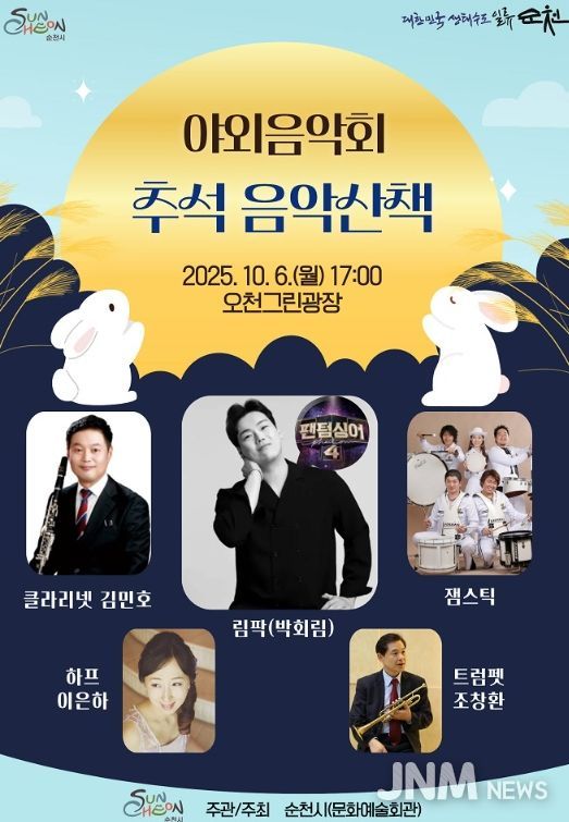 제이앤엠뉴스 | 순천시 문화예술회관은 추석 명절을 맞아 시민과 관광객을 위한 야외음악회 '추석 음악산책'을 10월 6일 추석 당일 오후 5시에 오천그린광장에서 개최한다고 밝혔다.