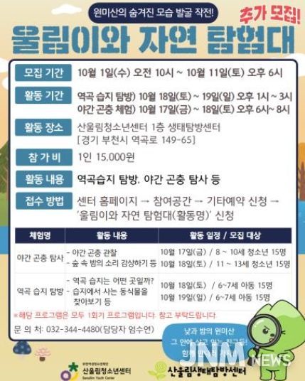 제이앤엠뉴스 | 부천여성청소년재단이 운영하는 산울림청소년센터는 환경부 지정 지역환경교육센터(제2024-01호)로서 '에코메이커데이' 참가자를 모집한다. 이번 프로그램은 청소년들이 자연을 가까이에서 체험하며 생태시민으로 성장하도록 돕기 위해 기획됐으며, 두 가지 방식으로 진행된다.