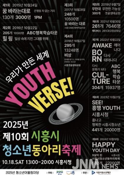 제이앤엠뉴스 | 10주년을 맞은 시흥시청소년동아리축제가 오는 10월 18일 시흥시청에서 개최된다. ‘우리가 만든 세계: YOUTHVERSE’를 주제로 열리는 이번 축제는 지난 10년간의 활동을 돌아보는 동시에 앞으로 축제가 나아가야 할 길을 내다보는 전환점이 될 것으로 보인다.