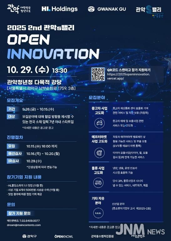 제이앤엠뉴스 | 관악구가 자동차, 물류 분야 글로벌 네트워크를 보유한 ‘HL홀딩스’와 함께 ‘2025 제2회 관악S밸리 오픈 이노베이션’에 참가할 기업을 모집한다.