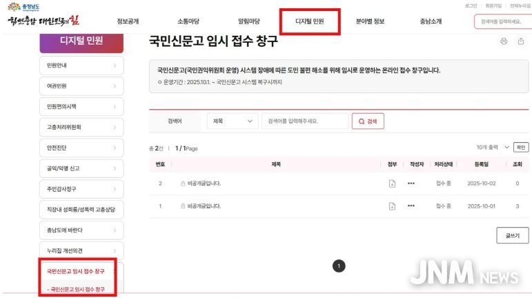 제이앤엠뉴스 | 충남도는 2일부터 도 누리집에 ‘국민신문고 온라인 임시 접수 창구’를 개설·운영하고 있다고 밝혔다.