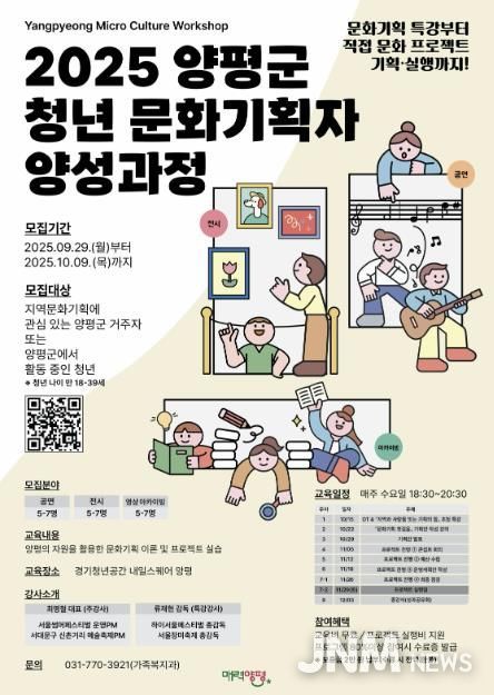 제이앤엠뉴스 | 양평군은 청년들의 문화·예술 기획 역량 강화를 통해 지역사회 문화 활성화와 청년 일자리 창출을 지원하고자 ‘2025년 양평군 청년 문화기획자 양성과정’을 10월부터 12월까지 운영한다고 밝혔다.