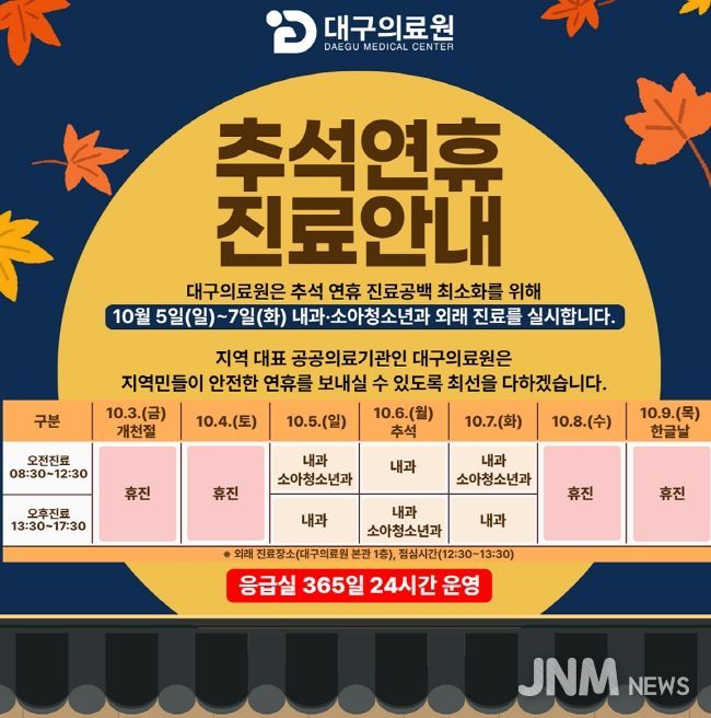 제이앤엠뉴스 | 대구의료원이 추석 연휴 기간(10.3.~10.9.) 응급실 운영을 강화하고, 10월 5일(일)부터 7일(화)까지 내과·소아청소년과 외래 진료를 실시한다.