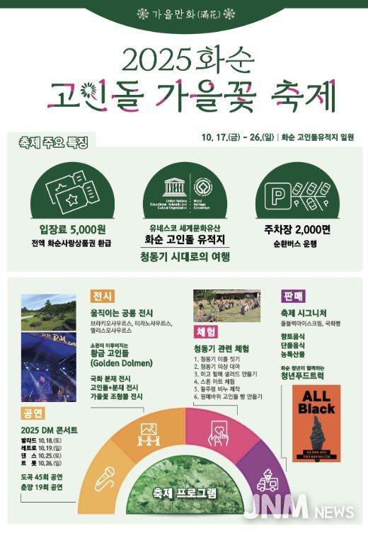 제이앤엠뉴스 | 전남 화순군)이 오는 10월 17일 ~ 10월 26일까지 10일간 유네스코 세계문화유산인 화순 고인돌 유적지 일대(춘양면 대신리, 도곡면 효산리)에서 '가을만화(滿花)'를 주제로 '2025 화순 고인돌 가을꽃 축제'를 개최한다.