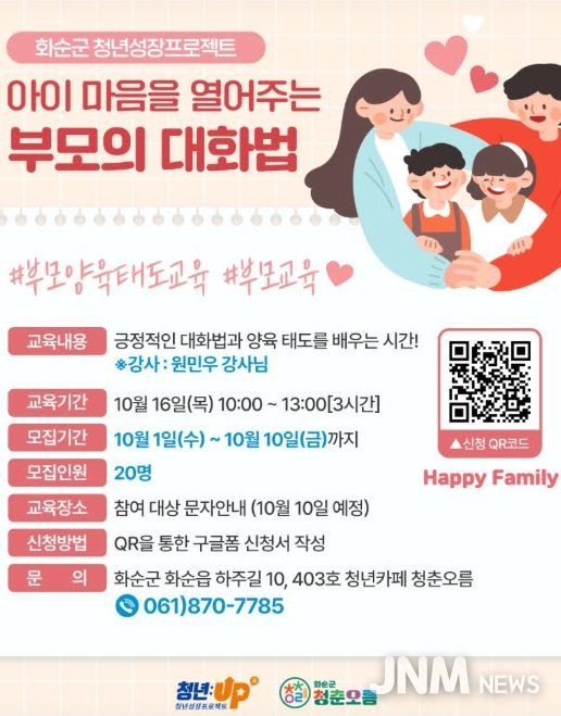 제이앤엠뉴스 | 화순군은 2일 청년성장 프로젝트 공모사업의 일환으로 개인별 맞춤형 부모 교육 프로그램을 진행한다고 밝혔다.