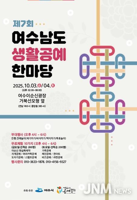 제이앤엠뉴스 | 여수시는 추석 연휴인 10월 3일부터 4일까지 이틀간 해양공원 소녀상 인근에서 ‘제7회 여수 남도 생활공예 한마당’을 개최한다.