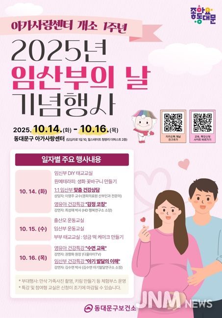 제이앤엠뉴스 | 서울 동대문구는 오는 14일부터 16일까지 아가사랑센터 개소 1주년과 ‘2025년 임산부의 날’을 맞아 다양한 기념행사를 개최한다고 밝혔다.