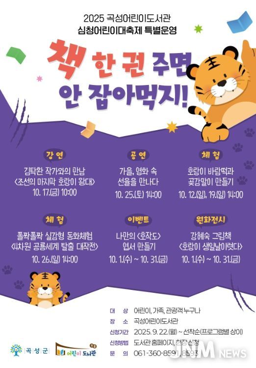 제이앤엠뉴스 | 곡성군은 다가오는 제25회 곡성심청어린이대축제를 기념하여 10월 한 달간 곡성어린이도서관에서 지역민과 방문객을 위한 다양한 볼거리와 독서문화 프로그램을 운영한다고 2일 밝혔다.