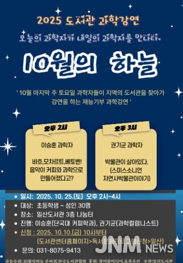 제이앤엠뉴스 | 고양특례시 일산도서관에서는 과학자들의 재능기부 도서관 과학 강연프로그램 ‘10월의 하늘’을 운영한다.