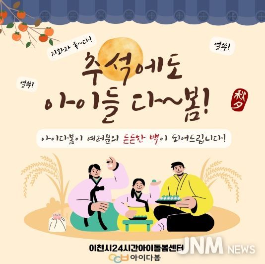 제이앤엠뉴스 | 이천시는 추석 연휴 기간에도 이천시 24시간 아이돌봄센터인 ‘아이다봄’을 365일 24시간 정상 운영해 연휴 중 발생할 수 있는 돌봄 공백을 최소화한다고 밝혔다.