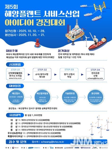 제이앤엠뉴스 | 해양수산부와 선박해양플랜트연구소(소장 홍기용, KRISO)는 해양플랜트 서비스산업의 미래 혁신을 주도할 청년 인재를 발굴하기 위해 ‘제5회 해양플랜트 서비스산업 아이디어 경진대회’를 개최한다고 밝혔다.
