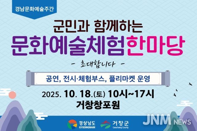 제이앤엠뉴스 | 거창군은 오는 18일 거창의 대표 관광지인 거창창포원 일원에서 ‘2025 문화예술체험한마당’을 성대하게 개최한다.
