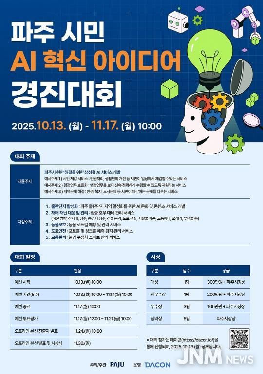 제이앤엠뉴스 | 파주시는 10월 13일부터 11월 17일까지 시민이 직접 참여하는 ‘파주 시민 인공지능(AI) 혁신 아이디어 경진대회’를 개최한다고 밝혔다.