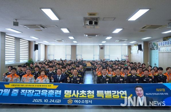 제이앤엠뉴스 | 여수소방서(서장 서승호)는 10월 24일 본서에서 전 직원 및 의용소방대원을 대상으로 청렴·소통 강화 및 전기차 화재대응 특별교육, 명사 초청 공직자 교육을 실시했다.