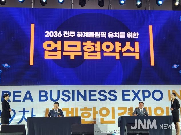 제이앤엠뉴스 | 전북특별자치도는 27일 인천 송도컨벤시아에서 열린 제29차 세계한인경제인대회 개회식에서 사단법인 세계한인경제무역협회(OKTA)와 전주 하계올림픽 유치를 위한 업무협약(MOU)을 체결했다.