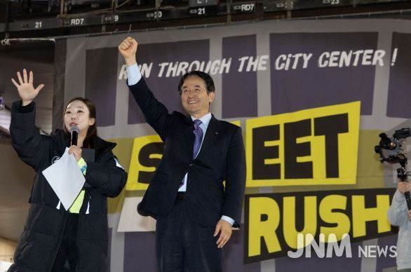 제이앤엠뉴스 | 이동환 고양특례시장이 지난 15일 열린 ‘2025 고양 스트릿 러쉬 in 라페스타’에서 “불빛과 사람이 가득한 도심 속을 시원하게 질주하며 열정 가득한 순간을 만끽하길 바란다”고 말하고, 선수들의 레이스를 관람하며 응원을 보냈다.