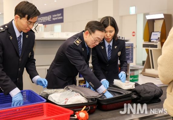 제이앤엠뉴스 | 관세청은 22일 이명구 관세청장이 인천공항을 찾아, 여행자 휴대품 검사관들과 함께 우범 수하물 선별 및 개장검사, 우범여행자 신체 및 밀리미터파 검색기 운용 등 마약 검사업무를 직접 수행하며 여행자 분야 마약 단속 현장을 점검하고, 지난 5일 발표한 ‘관세청 마약 단속 종합 대책’의 철저한 이행을 주문했다고 밝혔다.