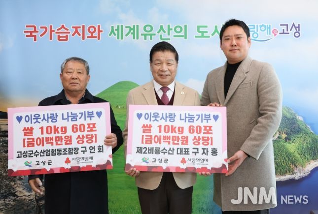제이앤엠뉴스 | 고성군 수산업협동조합 구언회 조합장과 제2비룡수산 대표 구자홍은 12월 26일 고성군을 방문하여 관내 경로당 지원을 위한 이웃사랑 나눔기부 쌀(10kg 120포) 400만 원 상당을 기탁하여 주위에 훈훈함을 선사했다.