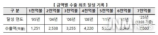 제이앤엠뉴스 | 산업통상부·관세청은 12월 29일 13시 03분 기준으로 잠정 집계한 결과 연간 누계 수출액이 7,000억 달러를 달성했다고 밝혔다.