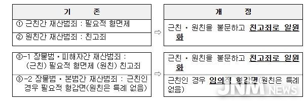 이번 「형법」 개정안에 따르면, ① 친족의 범위를 불문하고 친족간 재산 범죄는 친고죄로 일치시켜 규정하고, ② 장물범과 본범(예:절도범 등) 사이가 근친인 경우 현행 ‘필요적 감면’에서 ‘임의적 감면’으로 개정하며, ③ 근친・ 원친 여부를 불문하고 친고죄로 개정됨에 따라 「형사소송법」 및 「군사법원법」상 고소 제한 규정의 특례를 마련하여 자기・배우자의 직계존속에 대하여도 고소를 할 수 있도록 했다.