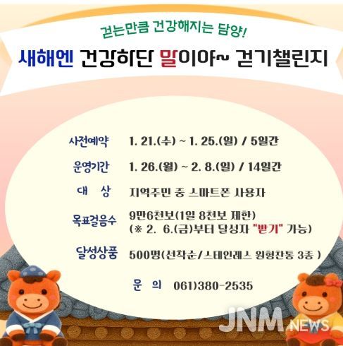 제이앤엠뉴스 | 담양군은 2026년 새해를 맞아 오는 1월 26일부터 2월 8일까지 온라인 걷기 챌린지 ‘새해엔 건강하단 말이야’를 운영한다고 밝혔다.