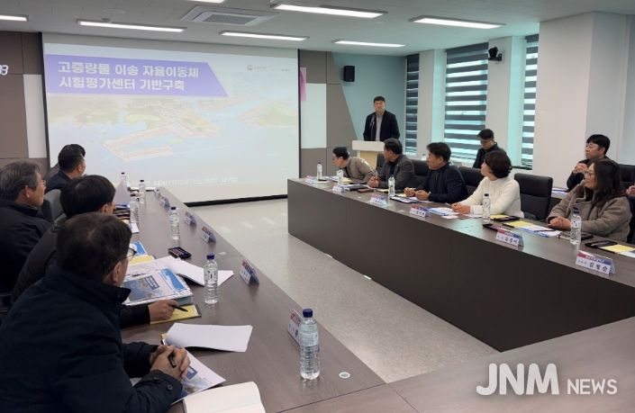 제이앤엠뉴스 | 경상남도는 16일 오전 10시 김해시 한림면 명동일반산업단지 내 미래자동차버추얼센터에서 ‘고중량물 AMR(자율이동로봇) 시험평가센터’ 추진상황 점검보고회를 개최했다.