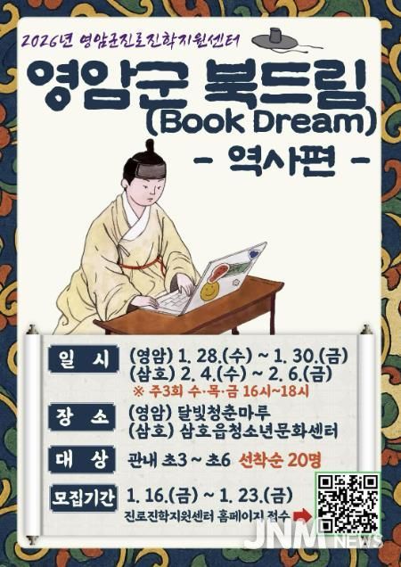 제이앤엠뉴스 | 영암군진로진학지원센터가 겨울방학을 맞아 초등학생의 사고력과 표현력을 키우는 독서토론 프로그램 ‘영암군 북드림-역사편’ 참가자를이달 23일까지 모집한다.