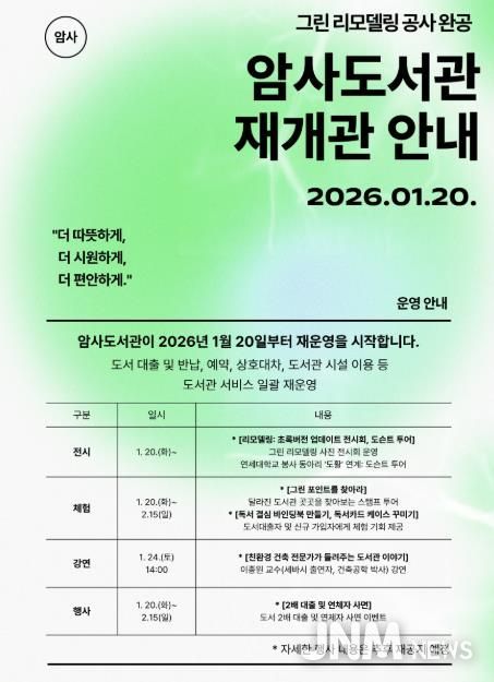 아울러 1월 24일에는 건축공학 전문가 이종원 교수를 초청해 ‘친환경 건축 전문가가 들려주는 도서관 이야기’ 특강을 열어 그린 리모델링의 가치를 구민들과 공유한다. 이밖에도 바인딩북·키링 만들기 체험과 도서 2배 대출, 연체자 사면 이벤트 등 책 읽기를 독려하는 다양한 행사가 마련된다.