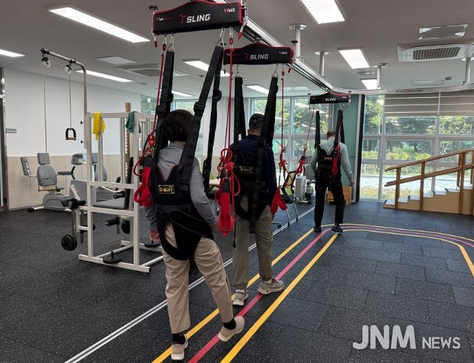 이 프로그램은 슈트를 착용한 후 레일을 따라 걷고, 슬링을 활용한 운동을 통해 신체 기능 회복과 근력 강화, 균형 능력 향상을 돕는다.