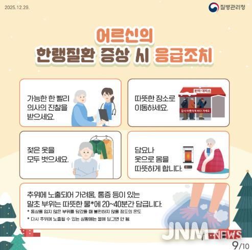 제이앤엠뉴스 | 전라남도는 겨울철 지속되는 한파로 저체온증과 동상 등 한랭질환 발생 위험이 커짐에 따라 특히 치매환자와 독거노인 등 취약계층에 대한 각별한 보호와 도민의 관심을 당부했다.