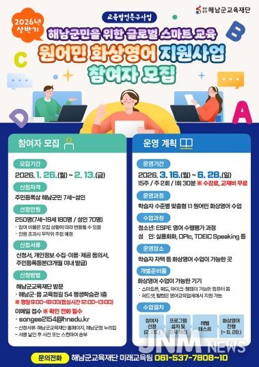 제이앤엠뉴스 | 재단법인 해남군교육재단(이사장 명현관)은 상반기 원어민 화상영어 지원사업의 참여자를 모집한다. 지난 2023년부터 시작된 원어민 화상영어 지원사업은 군민 누구나 양질의 영어 교육을 받을 수 있도록 해 지역 내 교육 불균형을 해소하고, 미래 글로벌 인재 양성에 기여하기 위해 운영되고 있다.