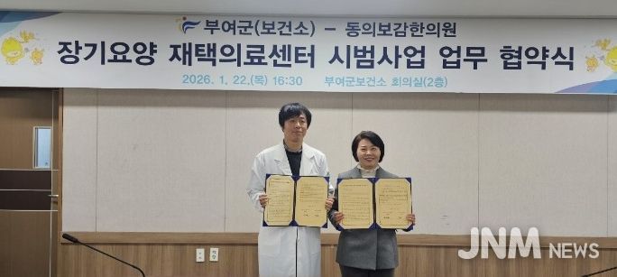 제이앤엠뉴스 | 부여군은 거동이 불편한 장기 요양 수급자가 재택에서 의료서비스를 받을 수 있도록 지원하는‘장기 요양 재택 의료센터 시범사업’추진을 위해 지역 의료기관인 동의보감한의원과 업무협약을 체결했다고 26일 밝혔다.