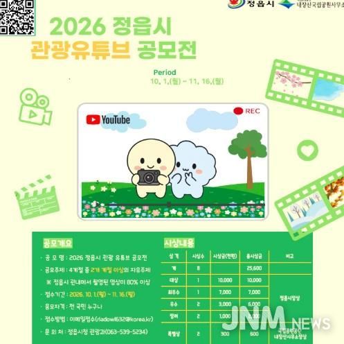 제이앤엠뉴스 | 정읍의 관광자원과 일상적 매력을 전국에 알리기 위해 정읍시가‘2026 정읍시 관광 유튜브 공모전’을 개최한다.