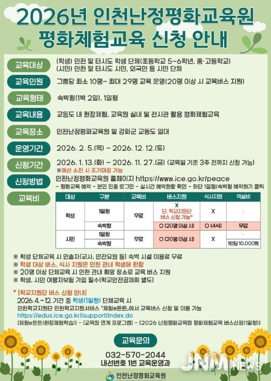 제이앤엠뉴스 | 인천광역시교육청난정평화교육원은 2월 5일부터 12월 12일까지 학생과 시민을 대상으로 ‘2026년 평화체험교육’을 운영한다.