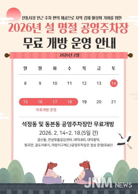제이앤엠뉴스 | 안성시시설관리공단은 2026년 설 명절을 맞아 2월 14일부터 18일까지 5일간, 공단이 관리하는 공영주차장 중 전통시장 인근에 위치한 석정동 공영주차장과 동본동 공영주차장을 한시적으로 무료 개방한다고 밝혔다.