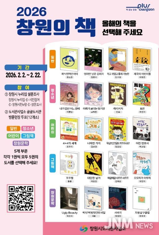 제이앤엠뉴스 | 창원특례시 도서관사업소는 2월 2일부터 2월 22일까지 '2026 창원의 책' 후보도서 20권에 대한 시민선호도 조사를 실시한다고 밝혔다.