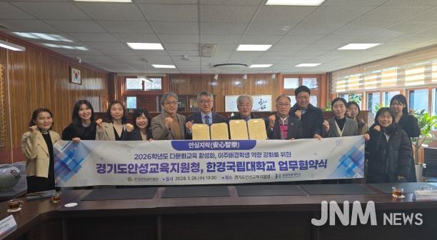 제이앤엠뉴스 | 경기도안성교육지원청은 2026년 1월 28일, 경기도안성교육지원청에서 한경국립대학교와 함께 안성 관내 다문화교육 활성화 및 이주배경학생 역량 강화를 위한 업무협약(MOU)을 체결했다.