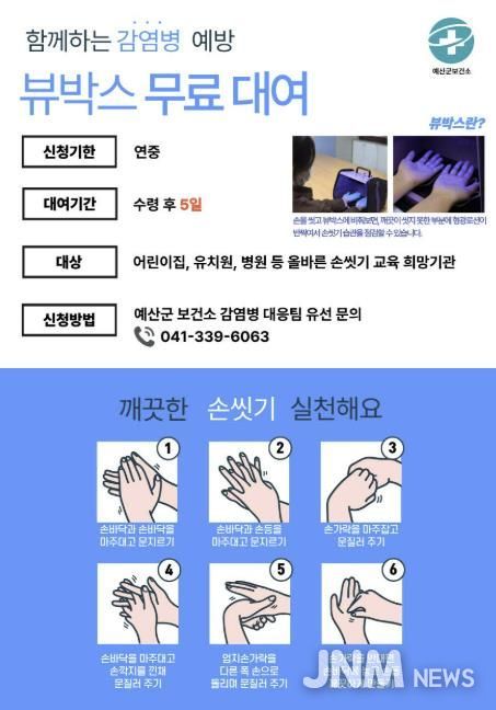 제이앤엠뉴스 | 예산군보건소는 지역 내 유치원과 어린이집, 초·중·고등학교, 병원 등을 대상으로 감염성 질환을 차단하고 올바른 손 씻기 습관 형성을 돕기 위해 ‘손 씻기 체험기기 무료 대여 사업’을 실시한다.