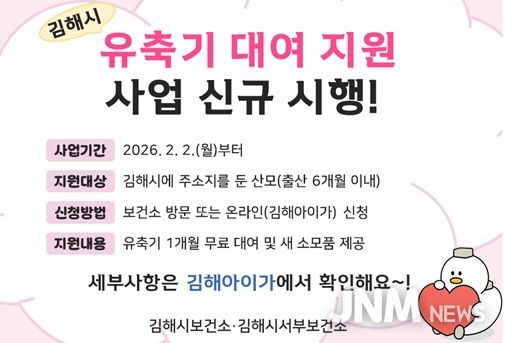 제이앤엠뉴스 | 김해시는 출산가정의 경제적 부담을 완화하고 건강한 양육 환경 조성을 위해 오는 2월 2일부터 ‘유축기 대여 지원 사업’을 본격적으로 시행한다고 29일 밝혔다.