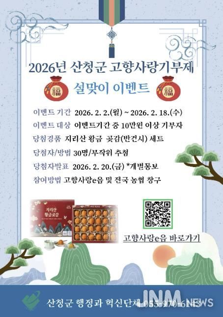 제이앤엠뉴스 | 산청군은 2월 2일부터 2월 18일까지 2026년 설 명절을 맞아 고향사랑기부제 활성화를 위한 특별 이벤트를 실시한다.