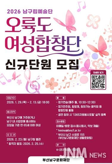 제이앤엠뉴스 | (재)부산남구문화재단은 남구립 오륙도여성합창단의 2026년 신규 합창단원을 1월 29일부터 2월 13일까지 공개 모집한다고 밝혔다.